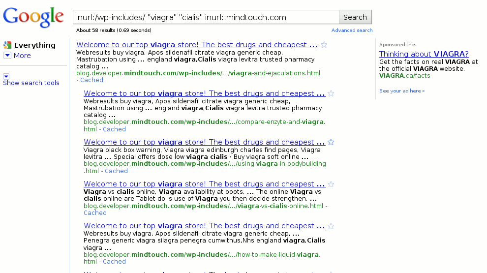 Finding more sites is easy. Just search on Google for “inurl:wp-includes” and choose your preferred spam word. Examples: